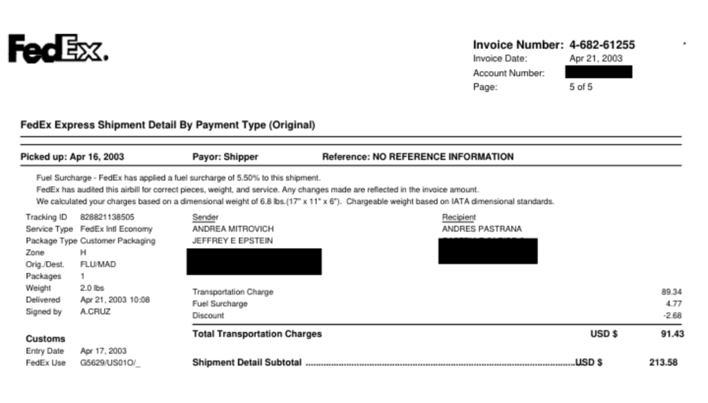 - Envíos documentados: Se registró un paquete enviado vía FedEx el 16 de abril de 2003 desde la dirección de Epstein con destino al expresidente colombiano.
