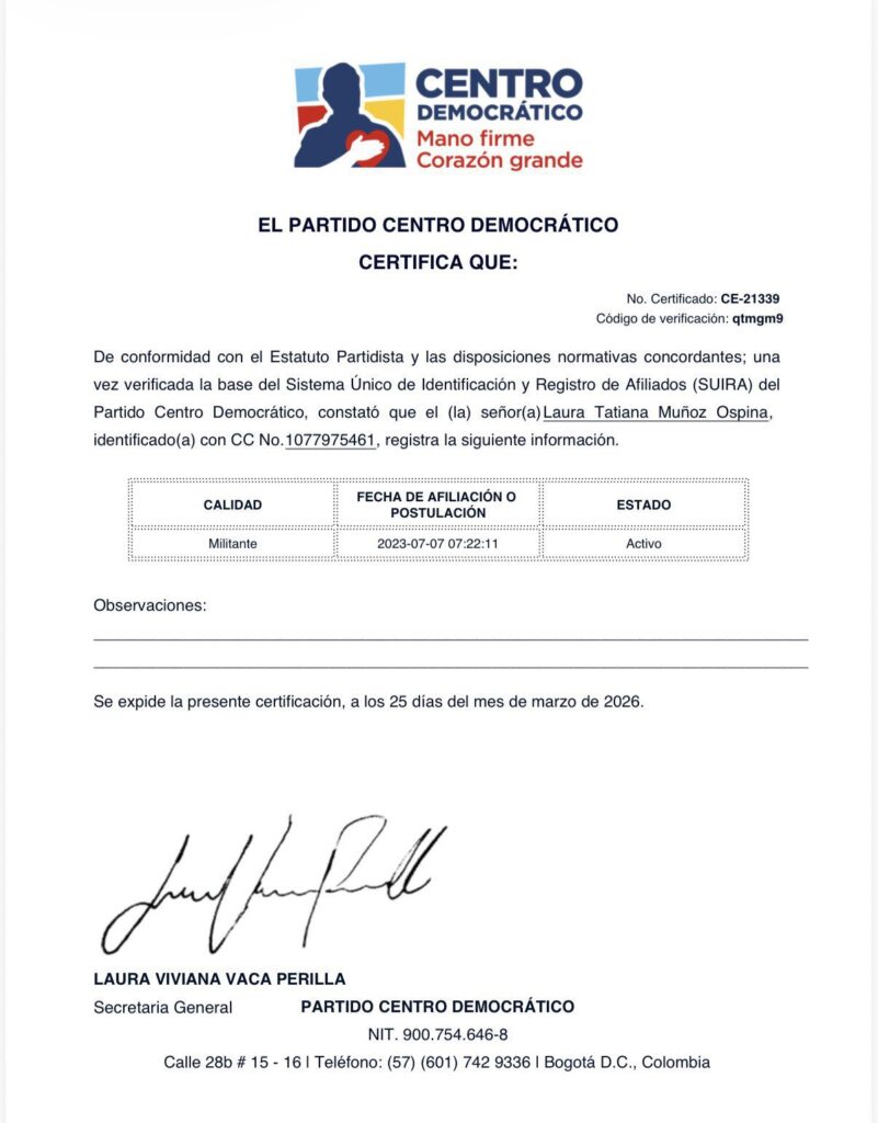 Según el certificado Muñoz Ospina se encuentra registrada en el Sistema Único de Identificación y Registro de Afiliados (SUIRA) desde el 7 de julio de 2023. Esta evidencia documental contradice las versiones de la vocera, quien sostiene no saber por qué aparece en los registros y asegura que oficiará al partido para “aclarar el asunto”.